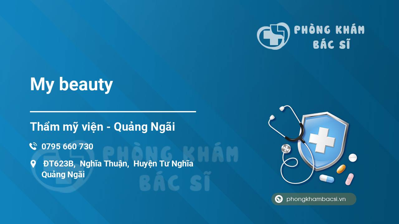 My beauty là Thẩm mỹ viện tại Quảng Ngãi, có địa chỉ tại ĐT623B, Nghĩa Thuận, Huyện Tư Nghĩa, Quảng Ngãi.