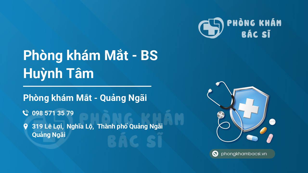 Phòng khám Mắt - BS Huỳnh Tâm là Phòng khám Mắt tại Quảng Ngãi, có địa chỉ tại 319 Lê Lợi, Nghĩa Lộ, Thành phố Quảng Ngãi, Quảng Ngãi.