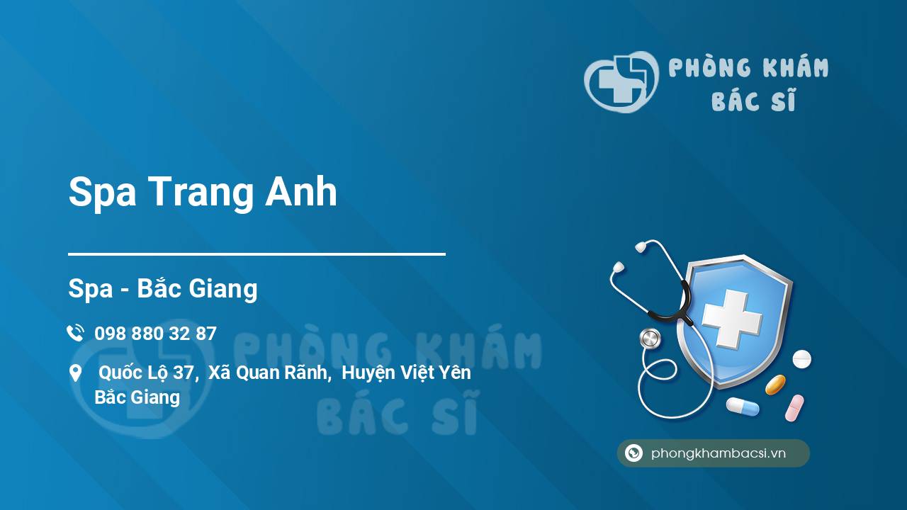 Spa Trang Anh là Spa tại Bắc Giang, có địa chỉ tại Quốc Lộ 37, Xã Quan Rãnh, Huyện Việt Yên, Bắc Giang.