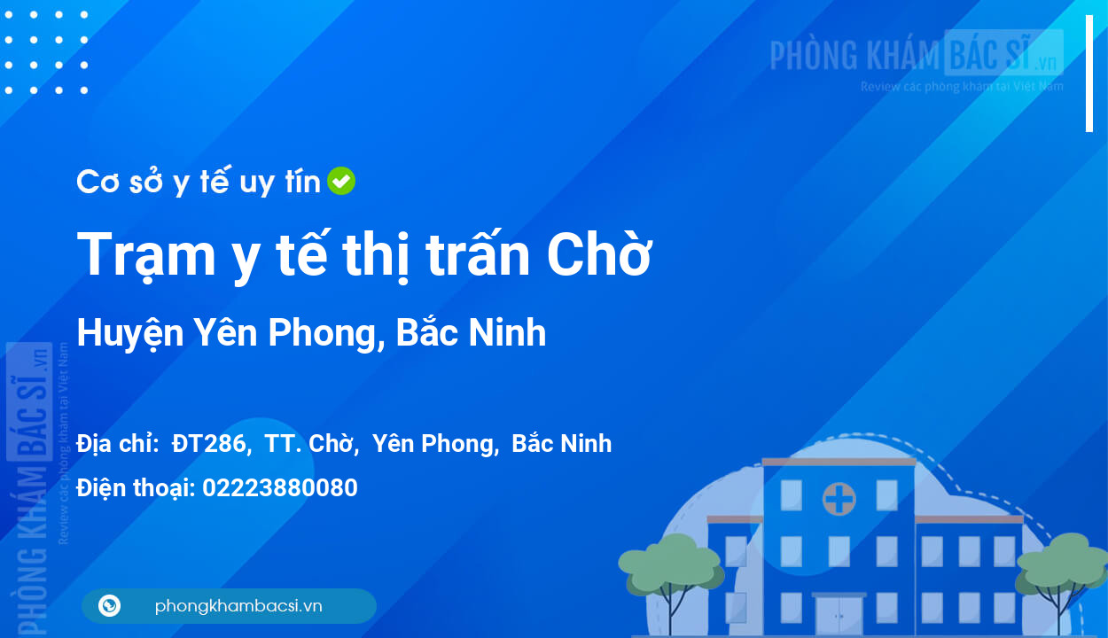 Trạm y tế thị trấn Chờ có trụ sở đặt tại ĐT286, Thị trấn Chờ, huyện yên Phong, tỉnh Bắc Ninh, bạn đang quan tâm đến các thông tin chi tiết về trạm y tế này như là địa chỉ, số điện thoại, thời gian làm việc, hình ảnh và các đánh giá của người dân về địa điểm này? Hãy cùng phongkhambacsi.vn tìm hiểu trong bài viết này nhé!